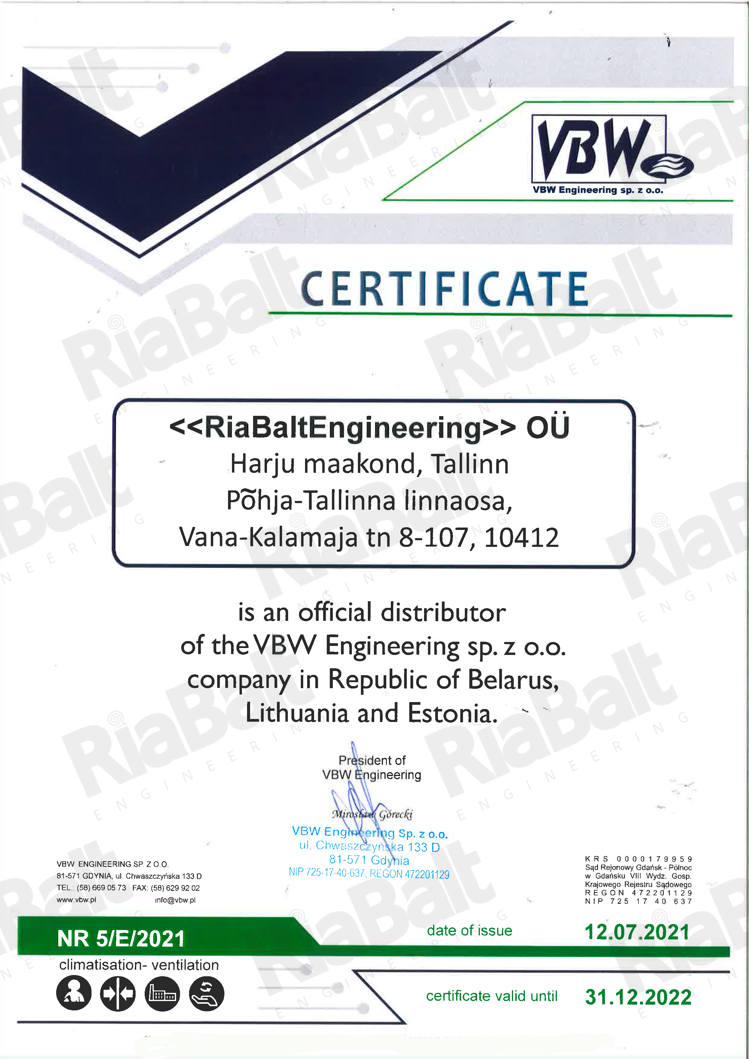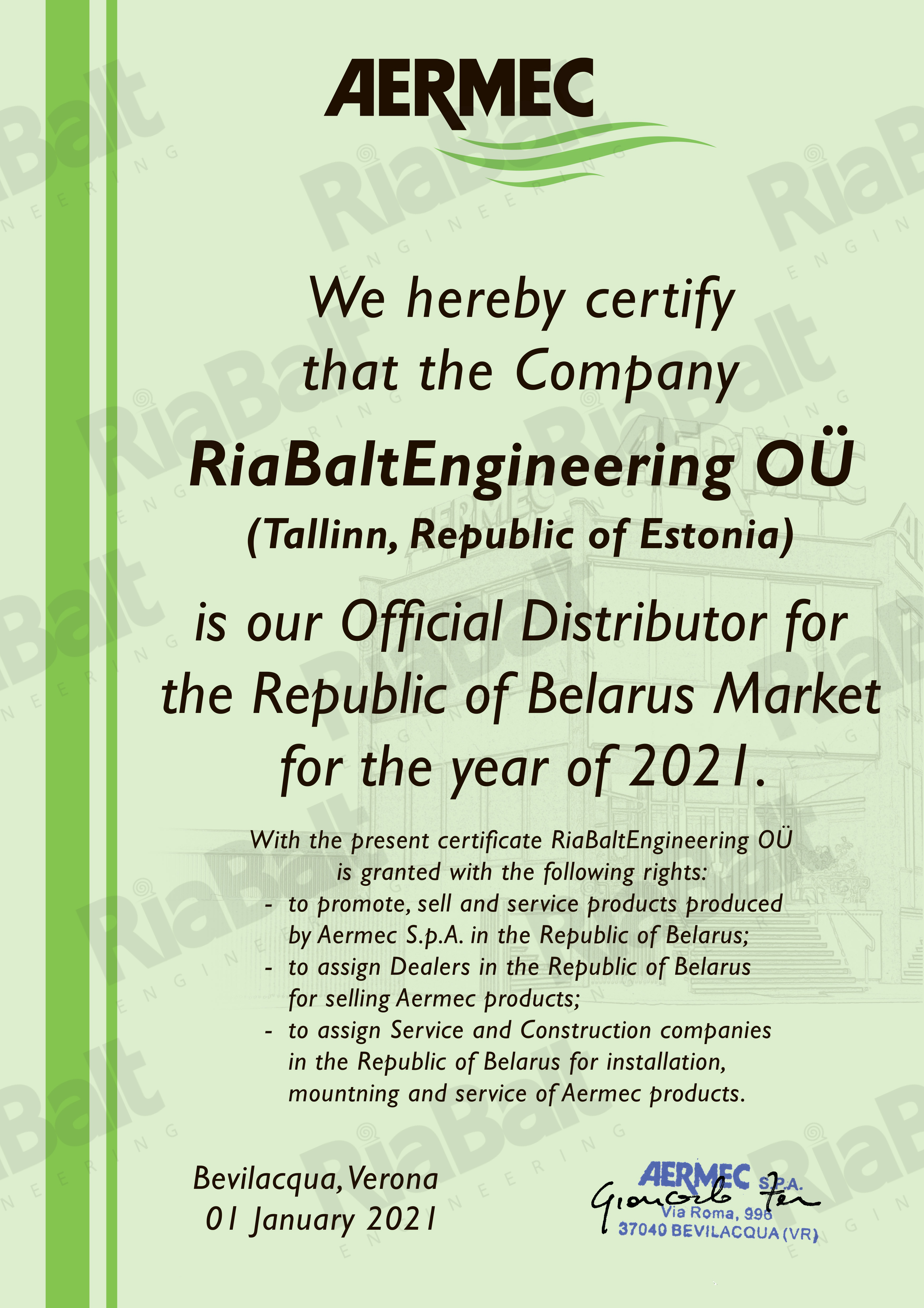 На территории Республики Беларусь RiaBaltEngineering OÜ является эксклюзивным дистрибьютором Aermec S.p.A. (Италия), дистрибьютором VBW Engineering Sp. z o.o. (Польша), дилером FläktGroup Baltics UAB (оборудование концерна FläktGroup Holding GmbH, Германия / Чехия).