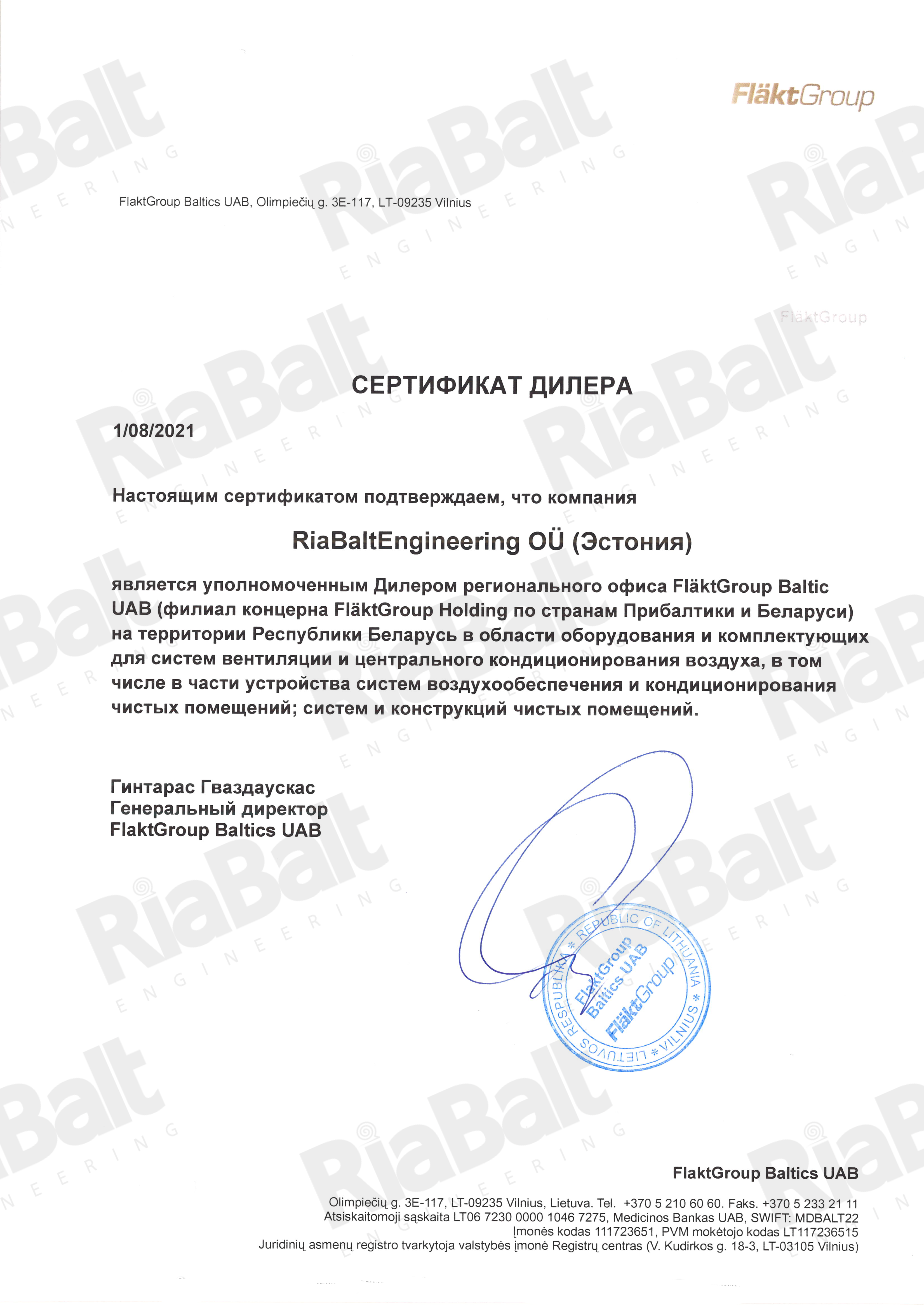Ассортимент продукции FläktGroup, предлагаемой RiaBaltEngineering OÜ:Компания RiaBaltEngineering OÜ является уполномоченным Дилером FläktGroup Baltic UAB (филиал FläktGroup Прибалтика) на территории Республики Беларусь в области оборудования и комплектующих для систем вентиляции и центрального кондиционирования воздуха в части устройства систем воздухообеспечения и кондиционирования чистых помещений.